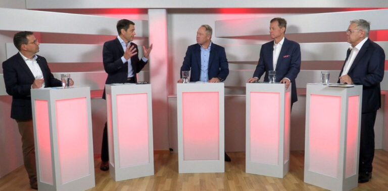 In der aktuellen Ausgabe des TV-Talks zu den Abkommen mit Brüssel kreuzen prominente Gäste die Klingen: Die Nationalräte Franz Grüter und Matthias Jauslin sowie Swissmem-Direktor Stefan Brupbacher und Pro-Schweiz-Präsident Stephan Rietiker.